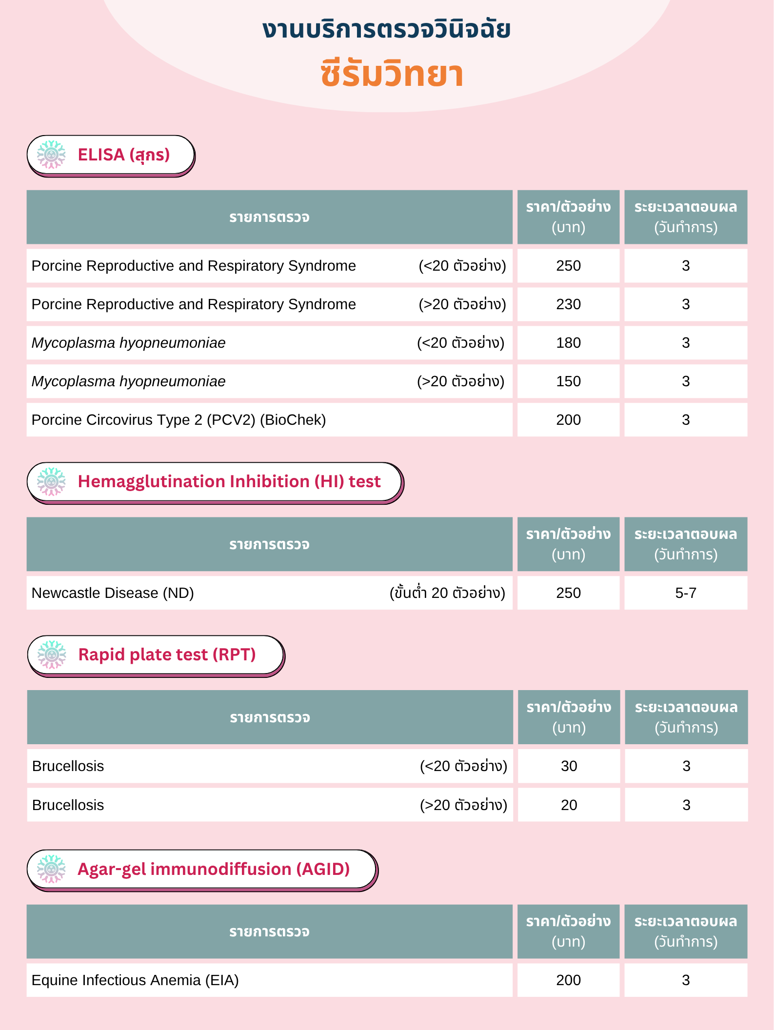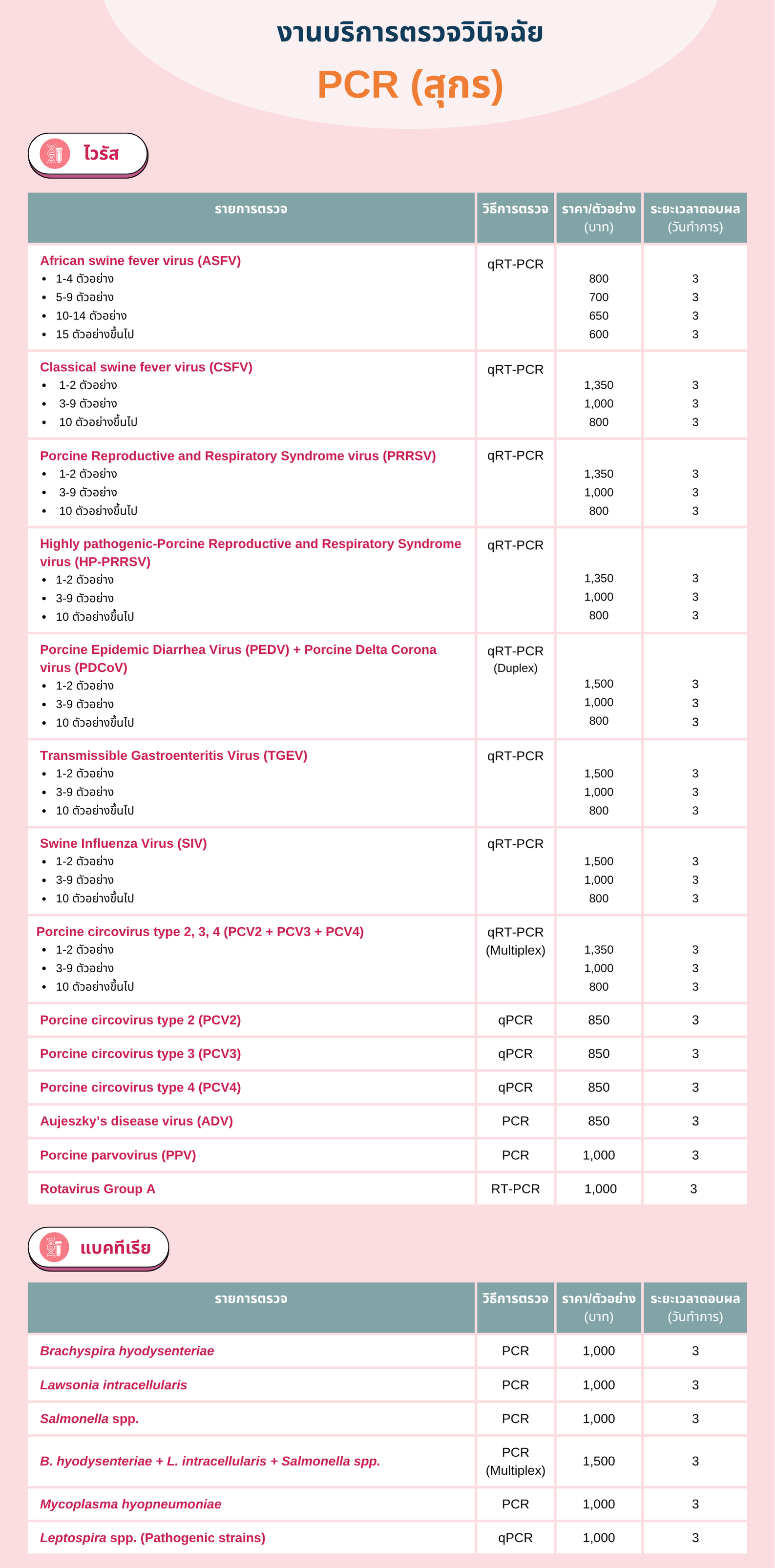 *Infectious bronchitis virus (IBV) เป็นการตรวจ screening หากต้องการทำ genotyping ต้องพิจารณาค่า ct ก่อน ว่าจะสามารถ sequence ได้หรือไม่ และจะทำการแยกเก็บค่าใช้จ่ายในการจำแนกสายพันธุ์ของเชื้อไวรัสในภายหลัง