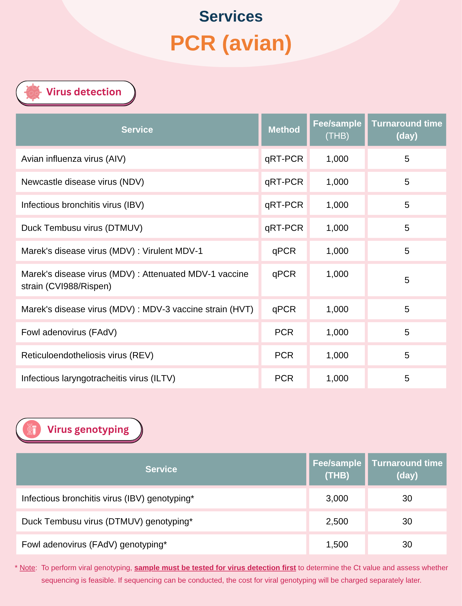 Disinfectant Effectiveness test (ฺVirus): 1. Disinfectant effectiveness test fee (per 1 dilution per 1 contact time) 2. Toxicity test fee (per 1 dilution per cell culture) 3. Processing fee (per order) |