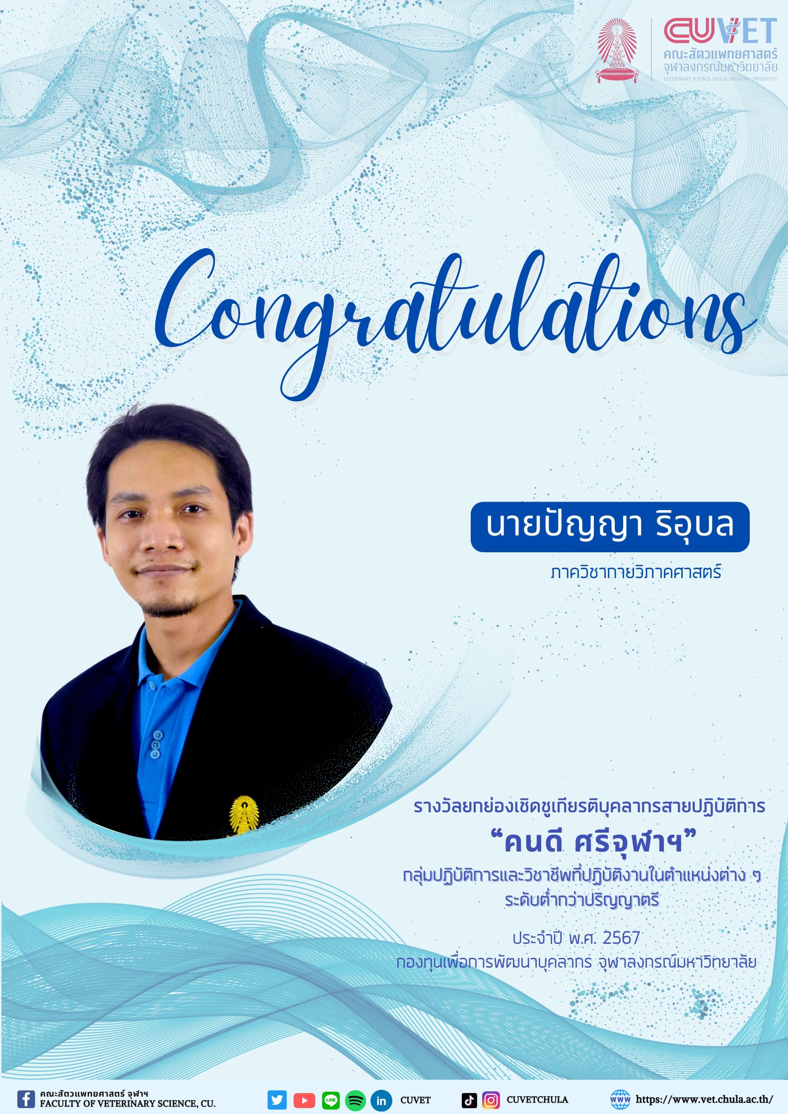 ในโอกาสที่ได้รับรางวัลยกย่องเชิดชูเกียรติบุคลากรสายปฏิบัติการ “คนดี ศรีจุฬาฯ” ประเภทบุคคล กลุ่มปฏิบัติการและวิชาชีพที่ปฏิบัติงานในตำแหน่งต่าง ๆ ระดับต่ำกว่าปริญญาตรี
