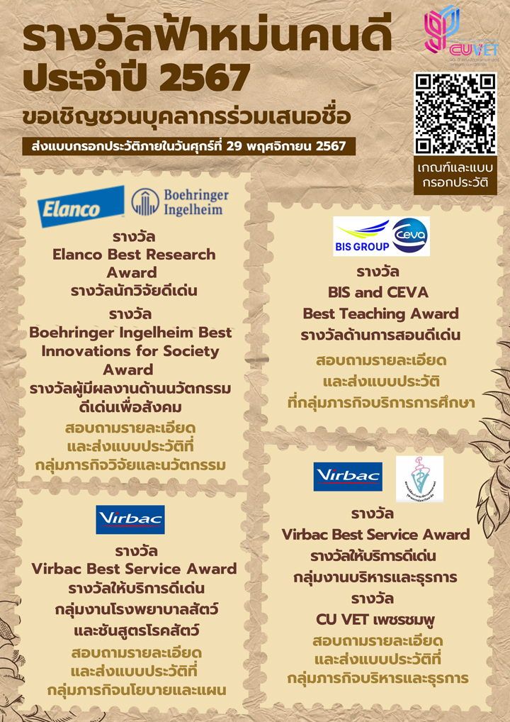 ขอเชิญชวนคณาจารย์ และ บุคลากร คณะสัตวแพทยศาสตร์ จุฬาลงกรณ์มหาวิทยาลัย เสนอชื่อเข้าชิงรางวัล ฟ้าหม่นคนดี